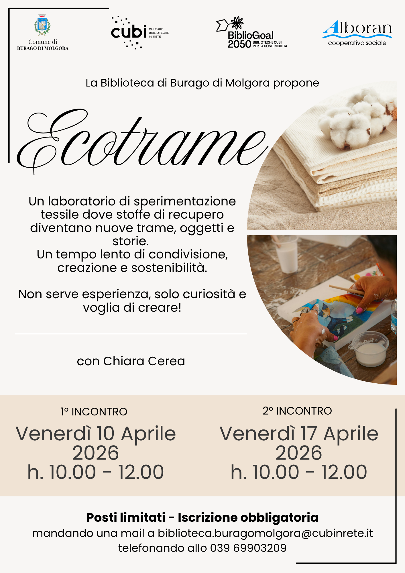 La Biblioteca di Burago di Molgora propone Ecotrame, un laboratorio di sperimentazione tessile dove stoffe di recupero diventano nuovi oggetti, trame e storie.