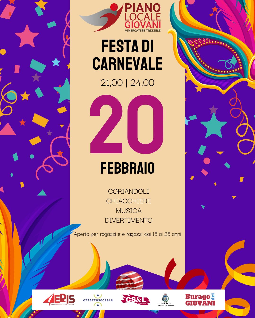 Il Piano Locale Giovani Vimercatese-Trezzo, in collaborazione con il Comune di Burago di Molgora, organizza una serata di Carnevale dedicata ai giovani per il giorno 20 febbraio dalle ore 21.00 alle ore 24.00
